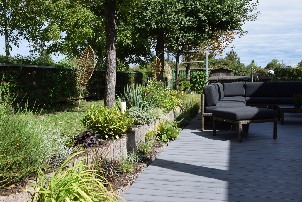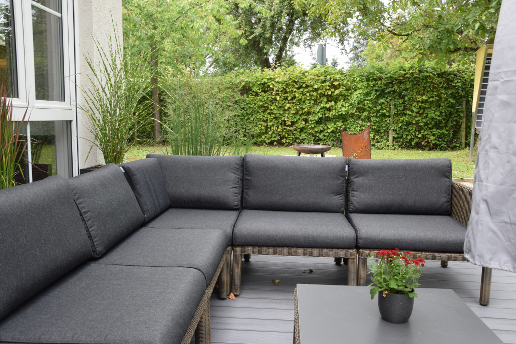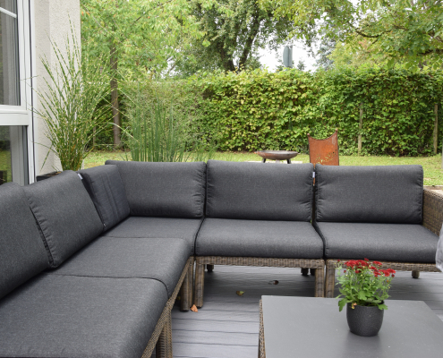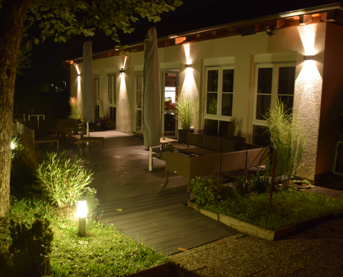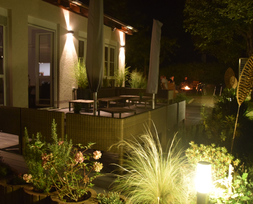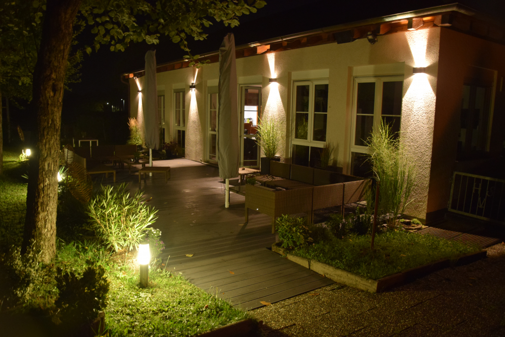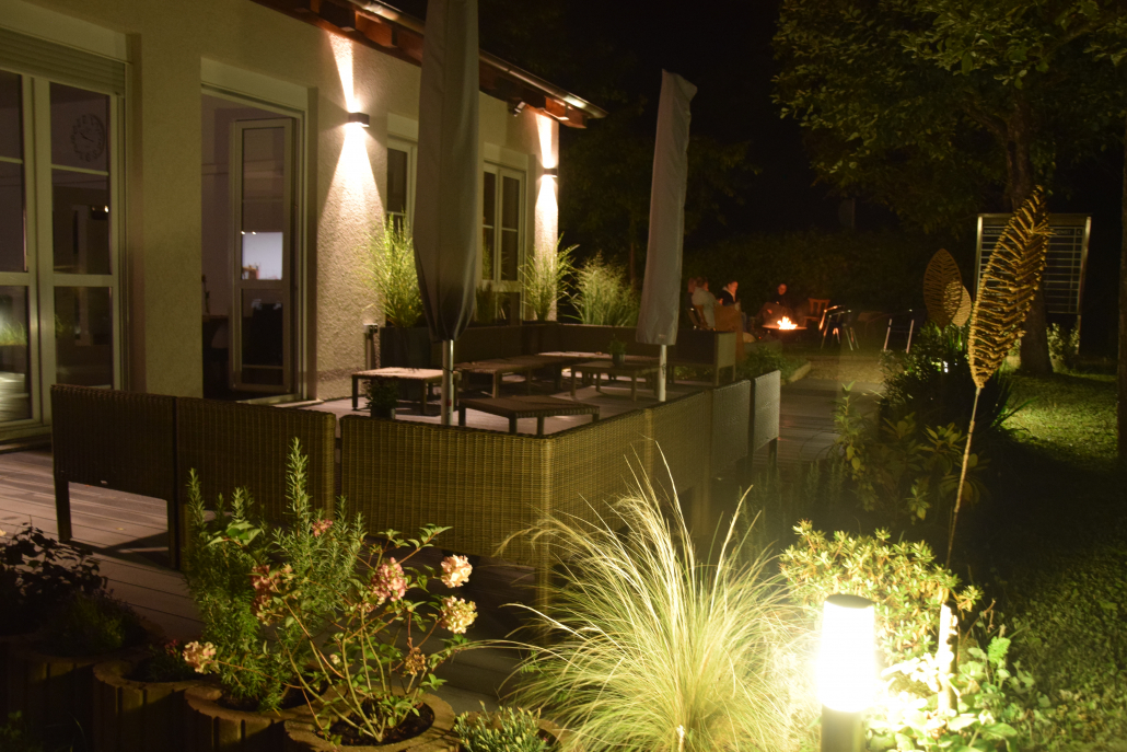 Die völlig neu gestaltete Terrasse mit großzügigen bequemen Loungemöbeln lädt zum entspannten Verweilen ein, die Gartenbeleuchtung schafft dabei eine einmalige Atmosphäre.