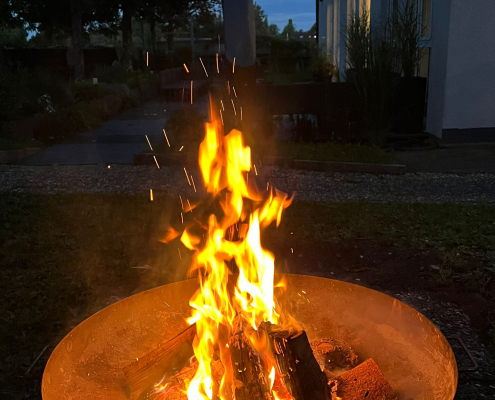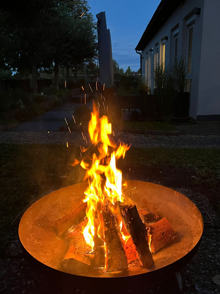 Ein schöner, am Abend beleuchteter Außenbereich mit Terrasse, Grillplatz und Grill lädt im Sommer zu Veranstaltungen unter freiem Himmel im Grünen ein. Eine große Feuerschale und dazu erhältliches Brennholz lassen den Abend stimmungsvoll ausklingen.