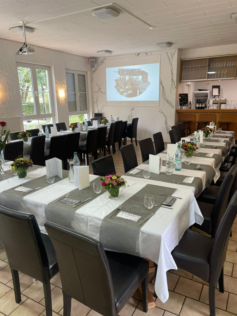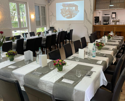 Die Bestuhlung kann flexibel nach Ihren Wünschen gestaltet werden, wie z.B. Einzeltische, Theateranordnung oder L/U-Formen, dazu stehen auf Wunsch auch Stehtische mit Hussen zur Verfügung.